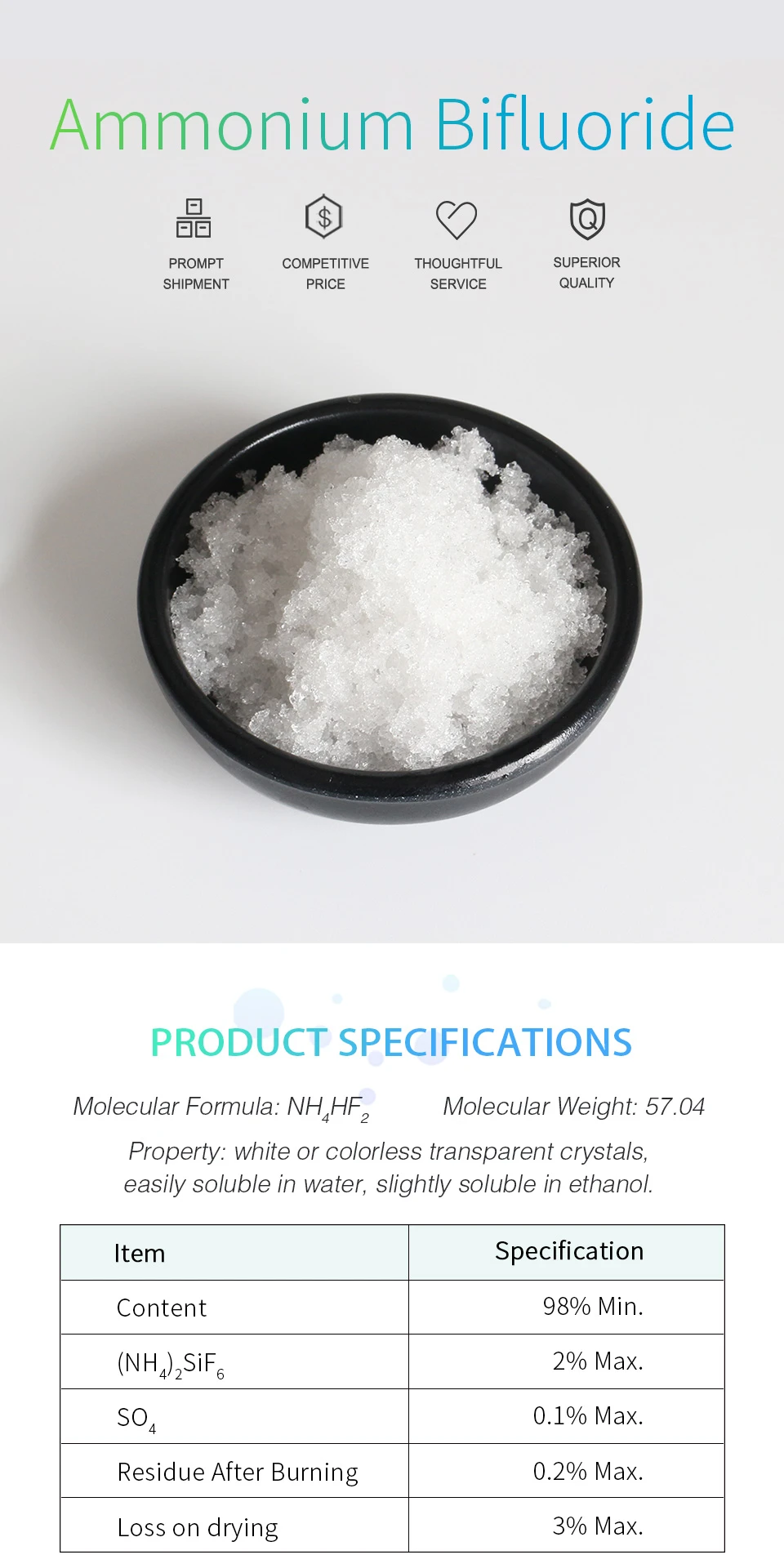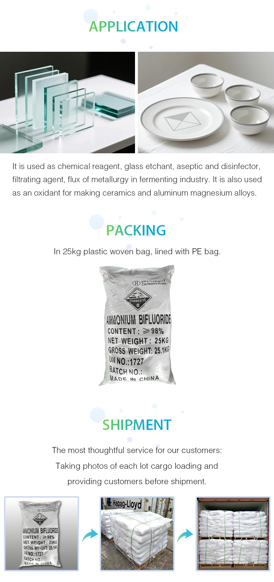 Usage:It is used as chemical reagent, glass etchant, aseptic and disinfector, filtrating agent, flux of metallurgy in fermenting industry. It is also used as an oxidant for making ceramics and aluminum magnesium alloys.
