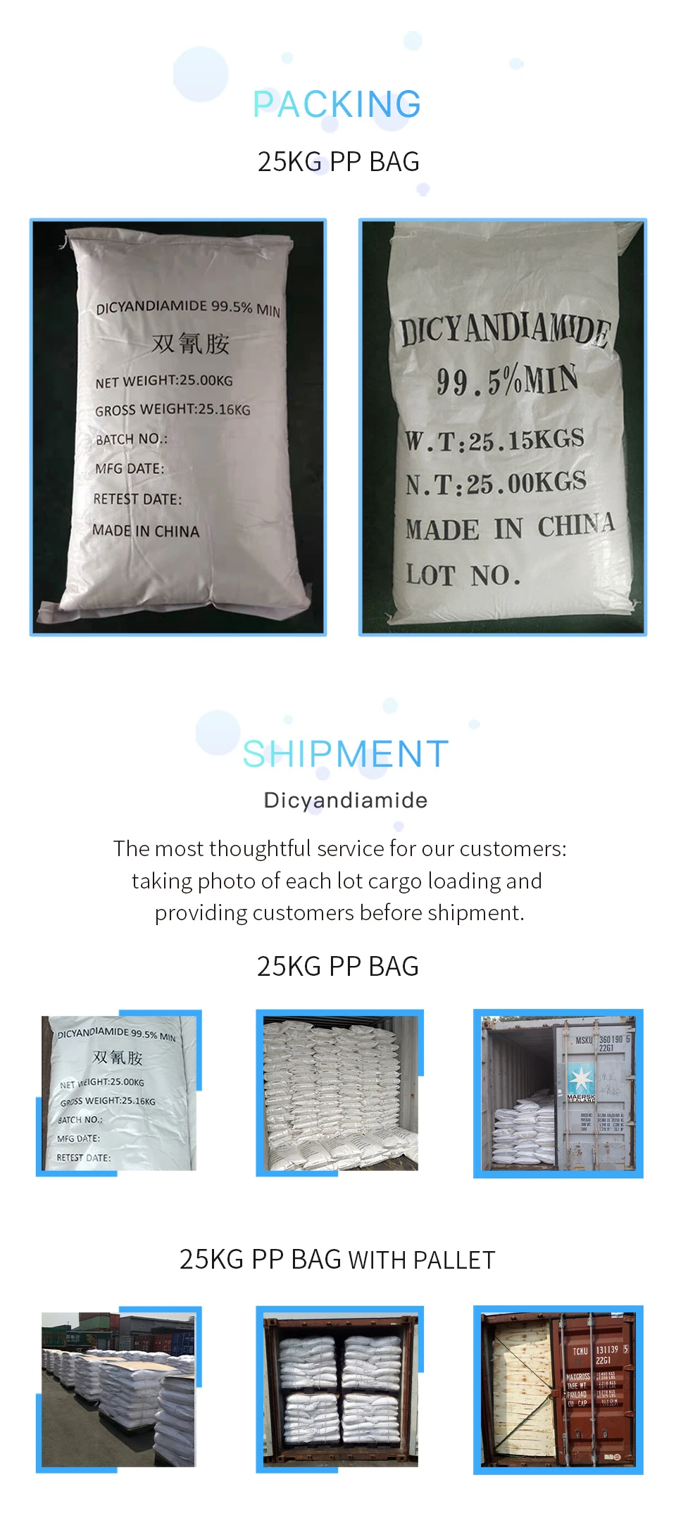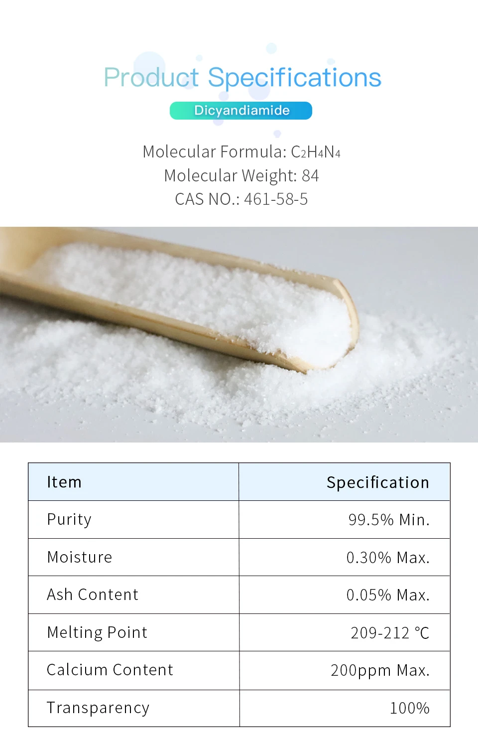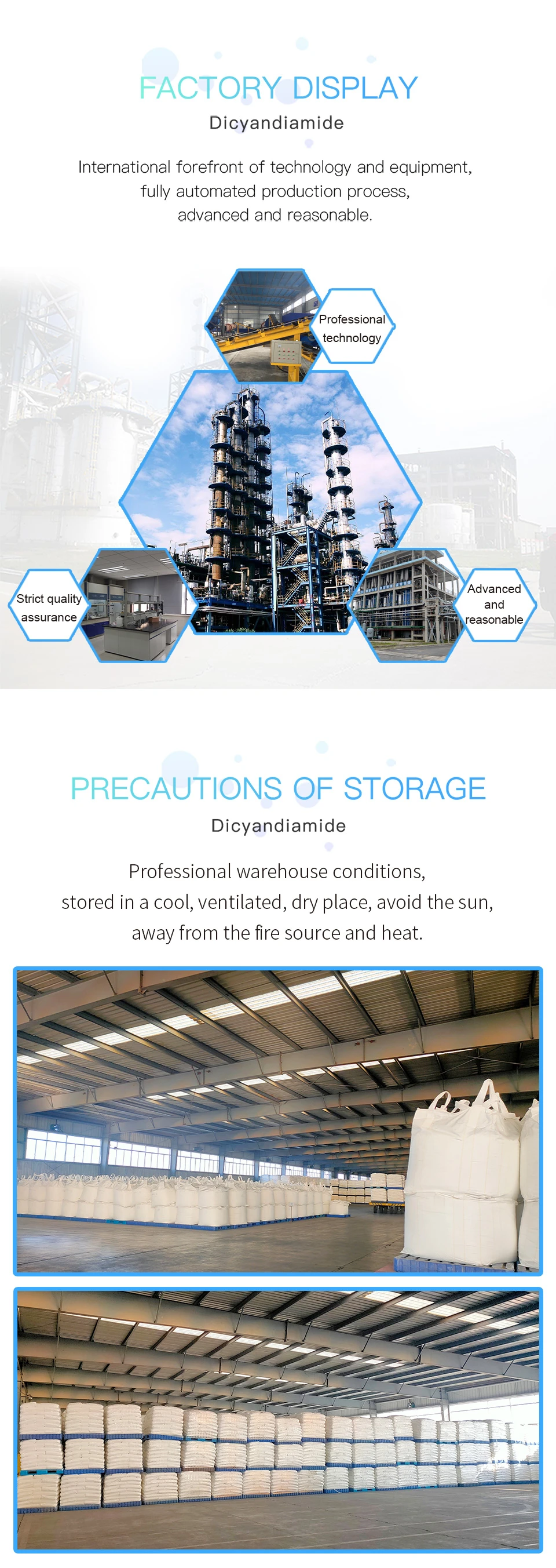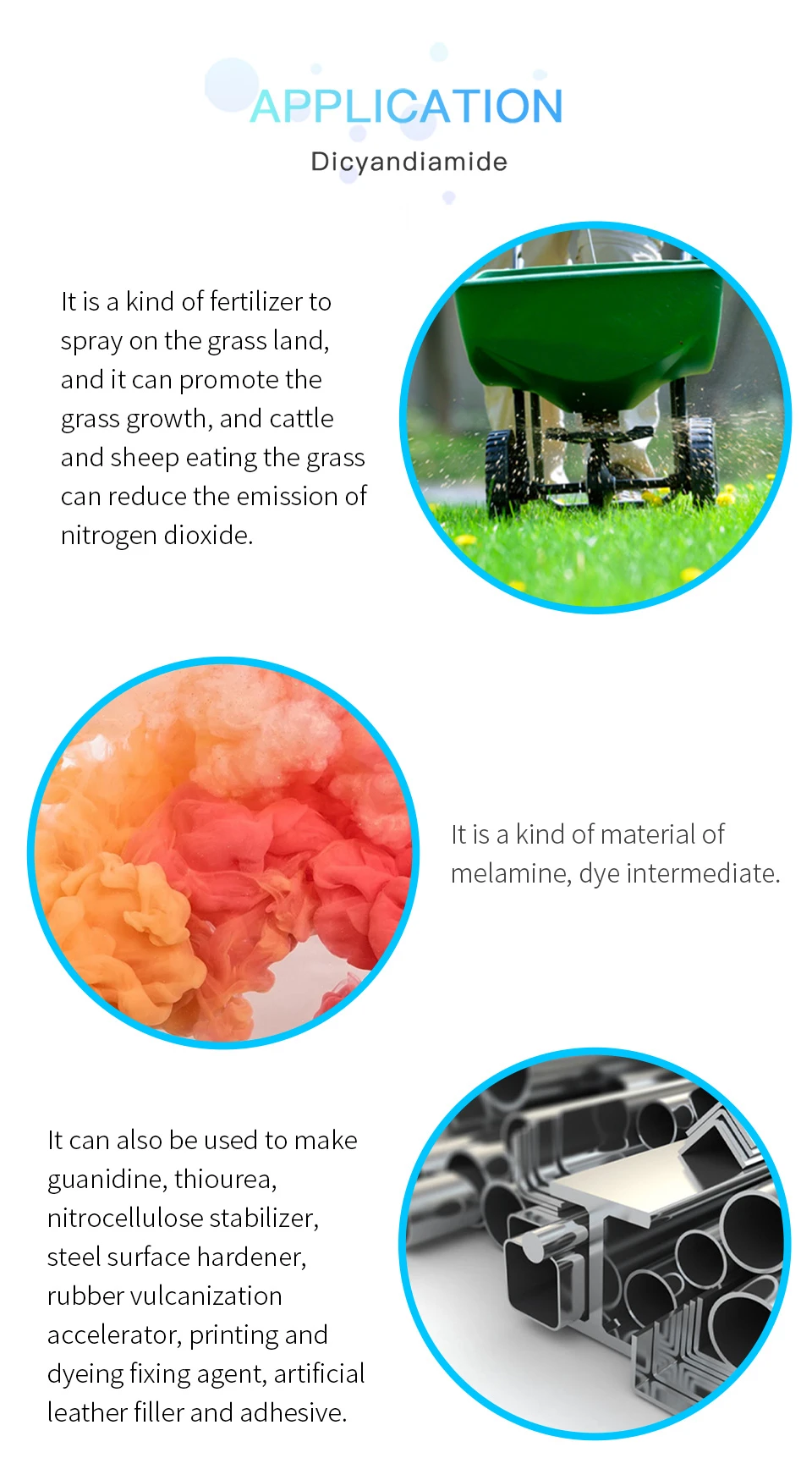 Usage:It is kind of material of melamine, and intermediate pan of synthetic drug, pesticides and coloring agent. It can be produced guanidine nitrate, sulfanilamide, sulfocarbamide, rubber accelerator, hardening of steel, fixing agent of dye printing, sizing agent, compound fertilizer, etc.