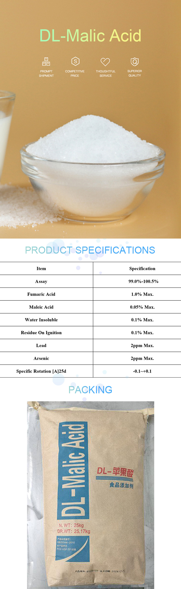Usage:Drinks (including lactobacillus drinks, milk drinks, carbonated drinks, cola), frozen foods (including sherbet and ice cream), processed foods (including wine and mayonnaise). It is used as color-keeper and antiseptic of juice. It is also used as emulsion stabilizer of egg yolk. DL-Malic acid also can be used as pharmaceutical intermediate, cosmetic, rinse, metal cleaner, buffering agent, retarder in textile industry, fluorescent whitening.