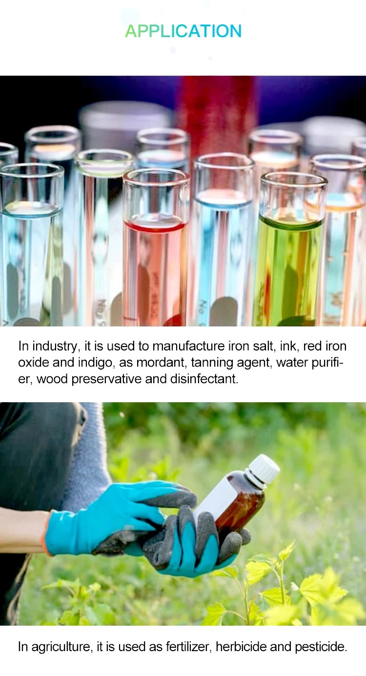 1. In industry, it is used to manufacture iron salt, ink, red iron oxide and indigo, as mordant, tanning agent, water purifier, wood preservative and disinfectant;