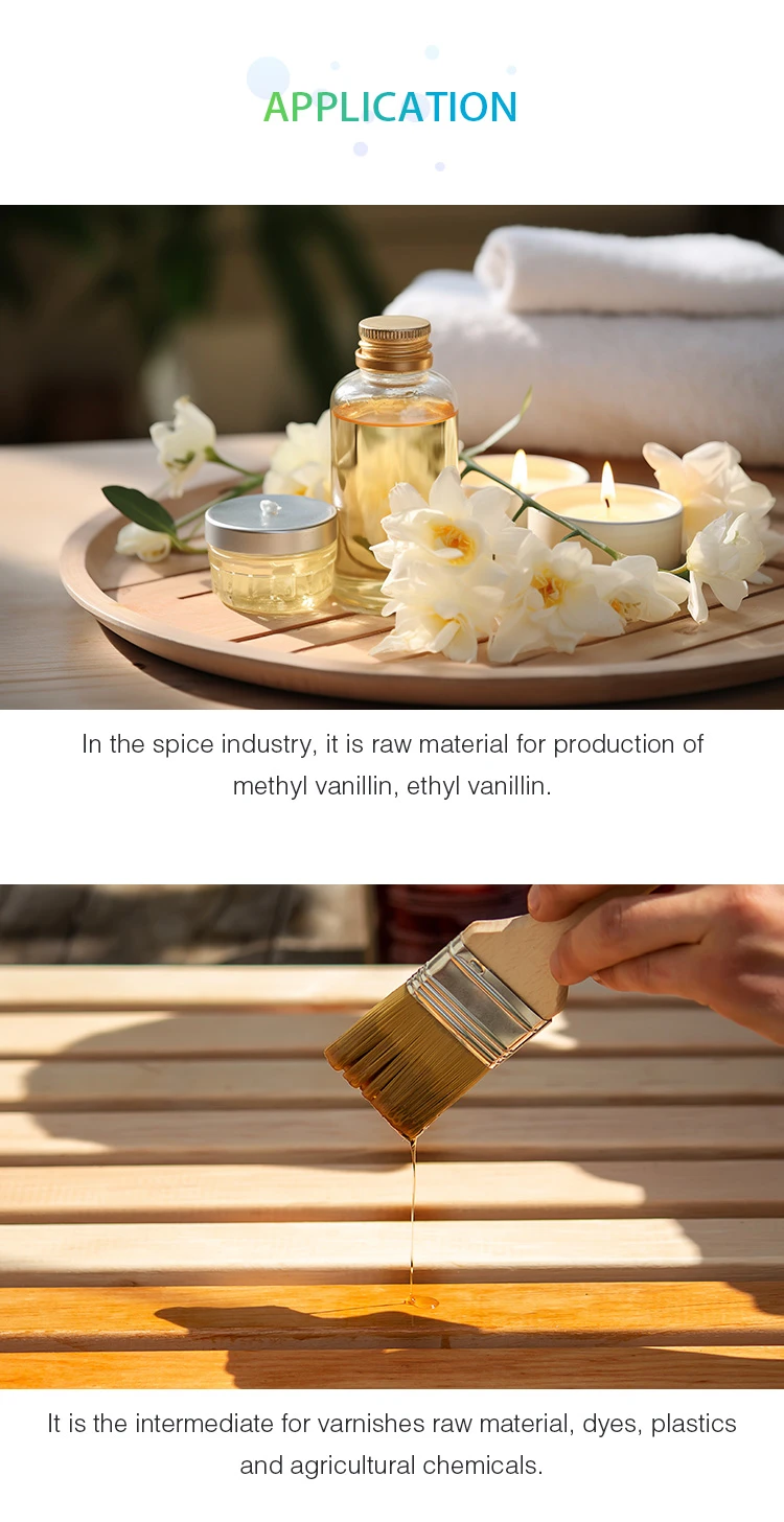 1. In the spice industry, it is raw material for production of methyl vanillin, ethyl vanillin.