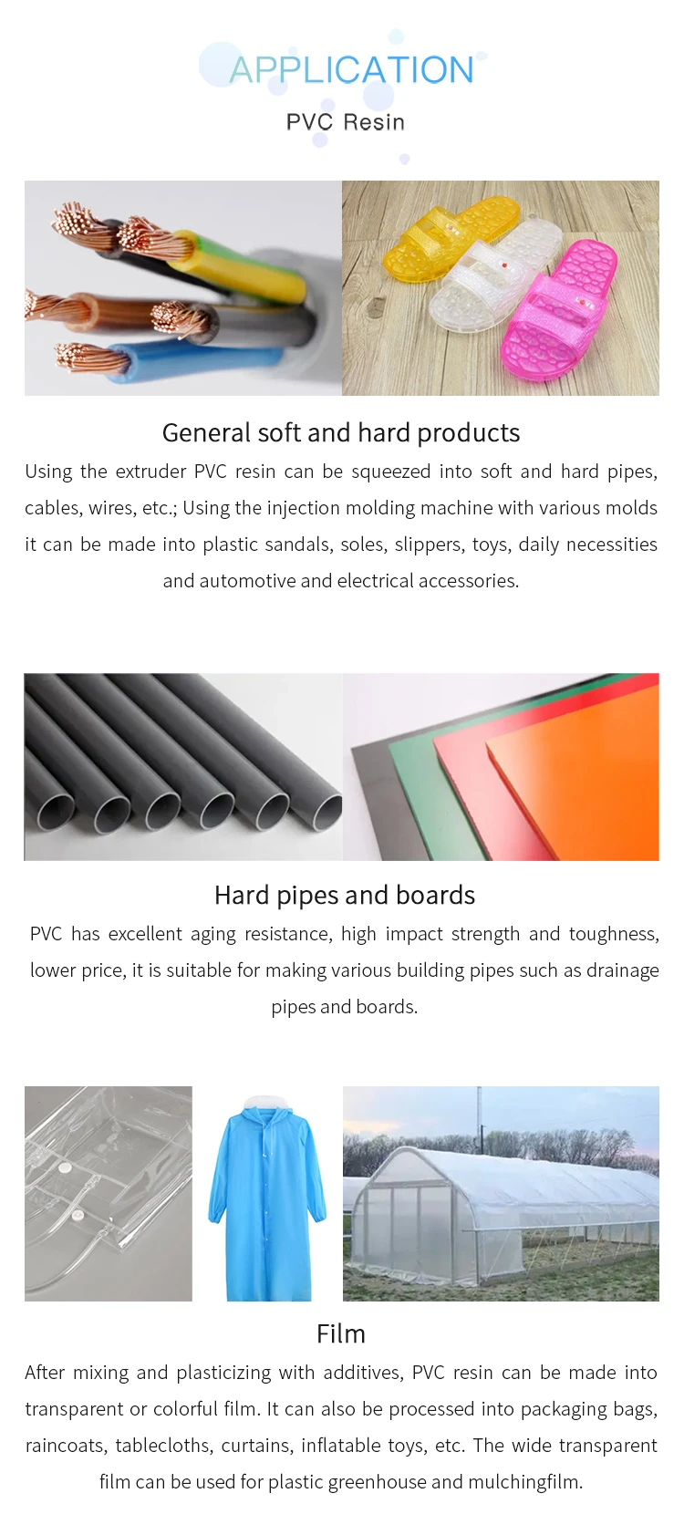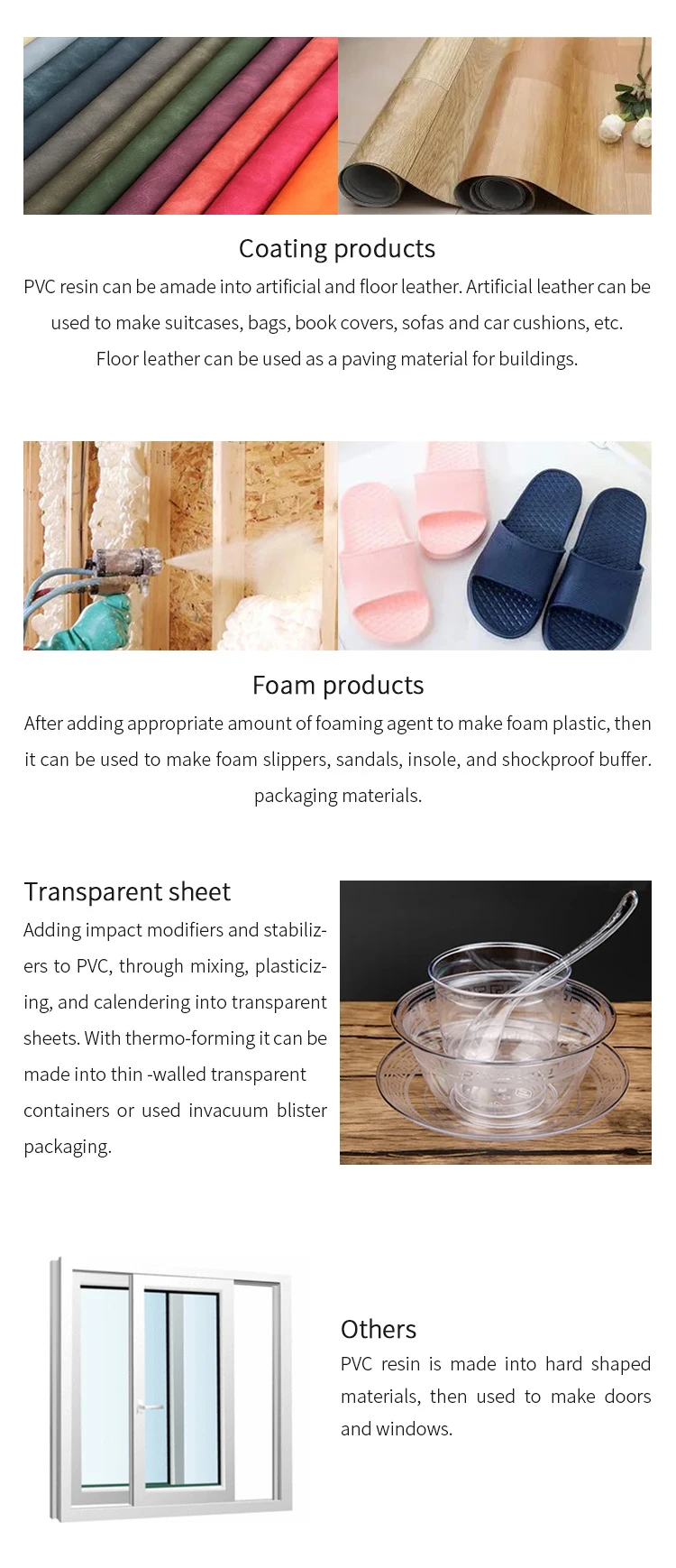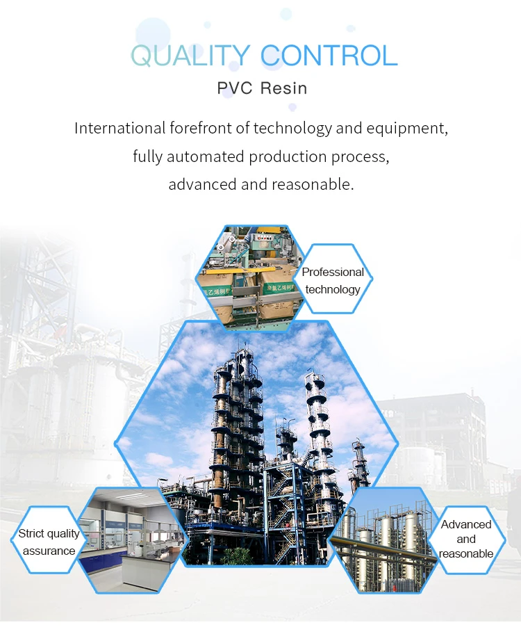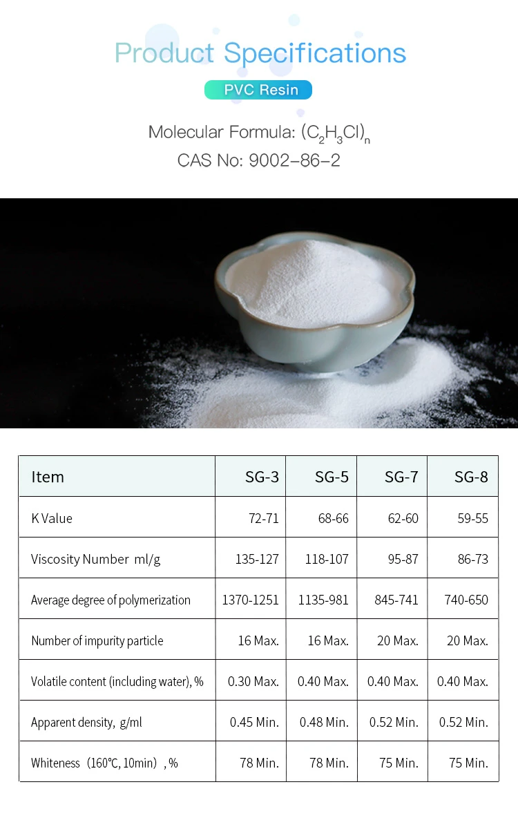 Usage:PVC resin can be processed into various plastic products, which can be divided into two categories of soft and hard products according to its usage. It is mainly used to produce transparent sheets, gold cards, blood transfusion equipment, soft and hard pipes, plates, doors and windows, bar sections, films, electrical insulation materials, cable sheaths, etc.