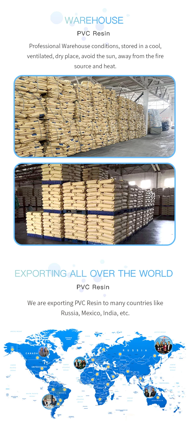 Property:PVC resin, the physical appearance is white powder, non -toxic and odorless. The relative density is 1.35-1.46, the refractive index is 1.544 (20℃). Insoluble in water, gasoline, alcohol and chloroethylene, soluble in solvents such as acetone, dichloroethane, xylene and so on. Chemical stability is high and has good plasticity.