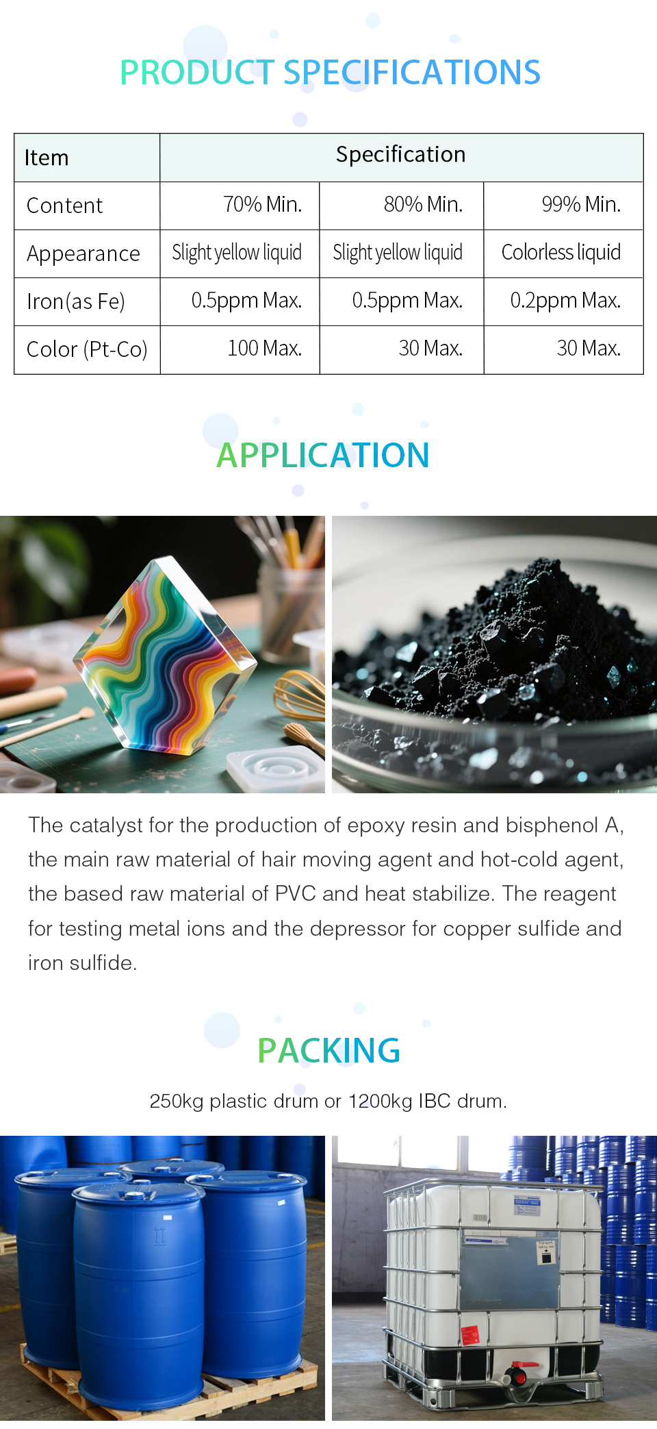 Usage:The catalyst for the production of epoxy resin and bisphenol A, the main raw material of hair moving agent and hot-cold agent, the based raw material of PVC and heat stabilize. The reagent for testing metal ions and the depressor for copper sulfide and iron sulfide.