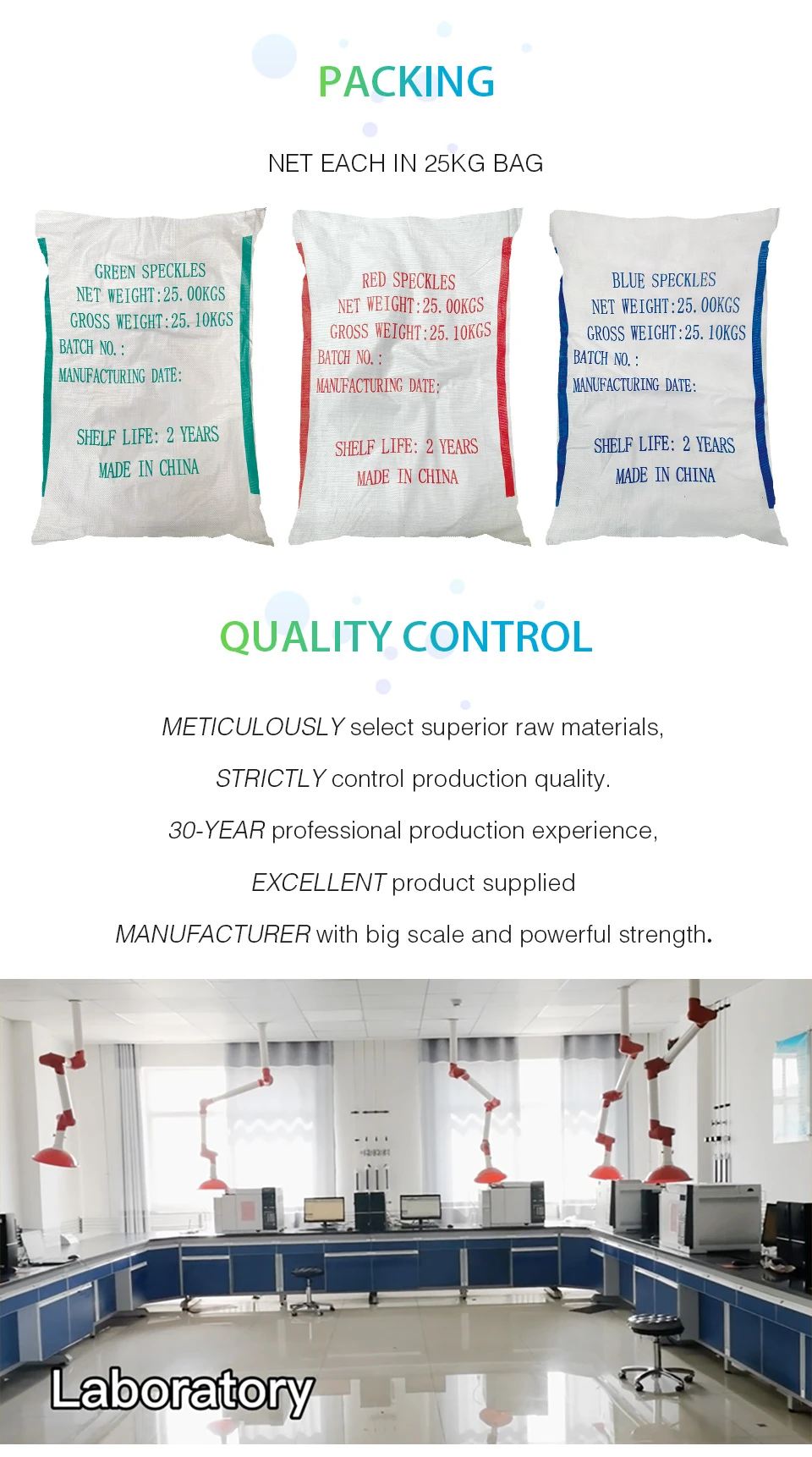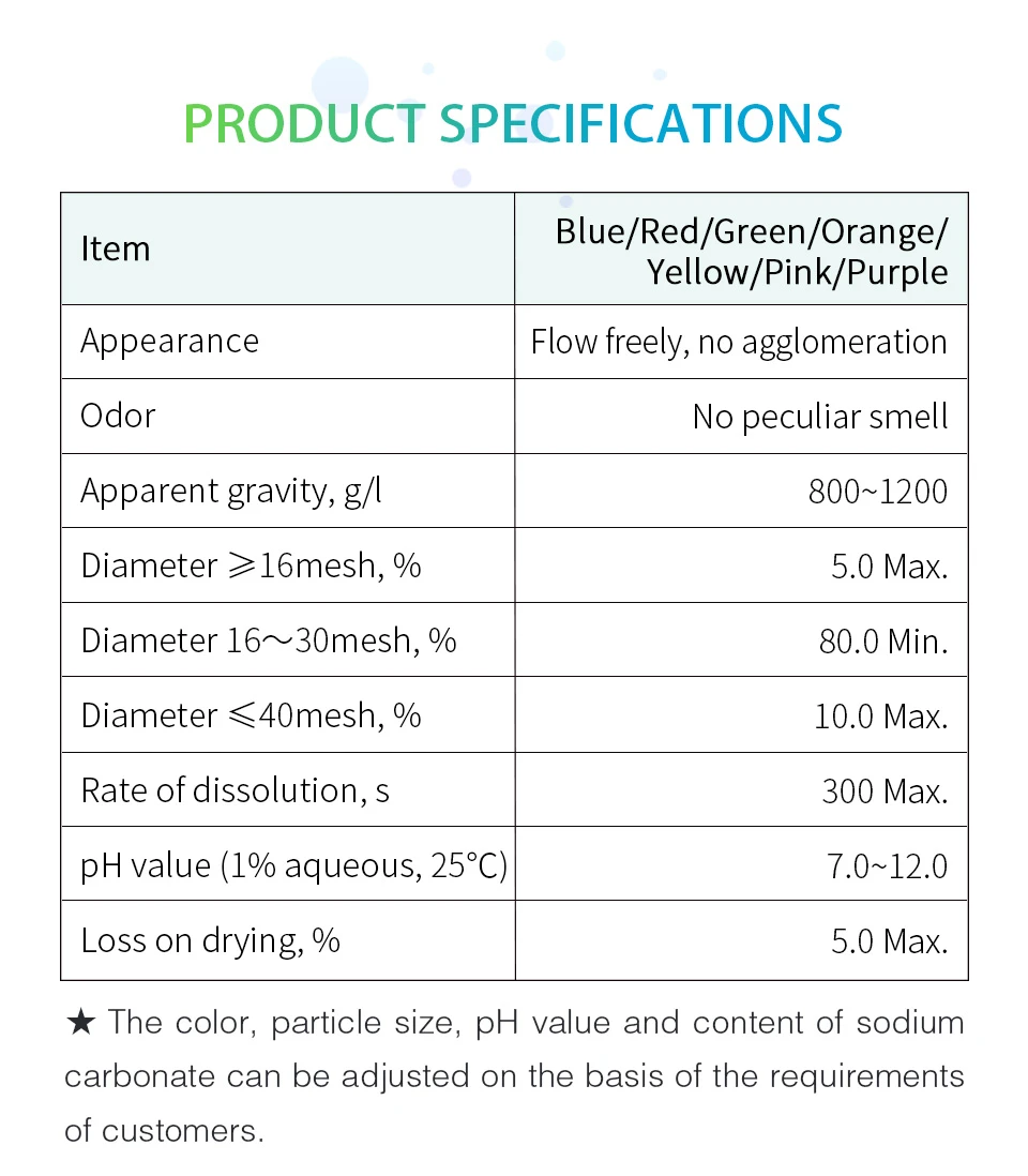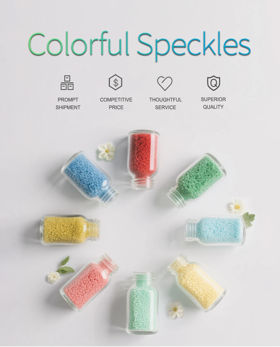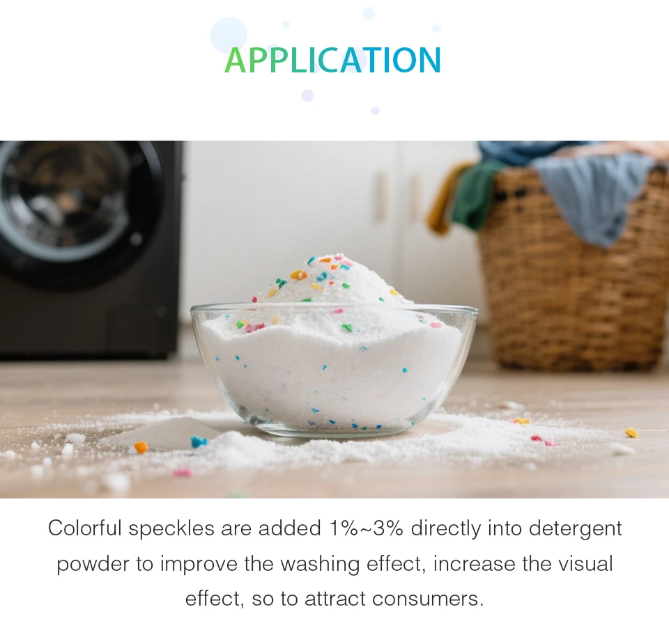 Usage:Colorful speckles are added 1%~3% directly into detergent powder to improve the washing effect, increase the visual effect, so to attract consumers.