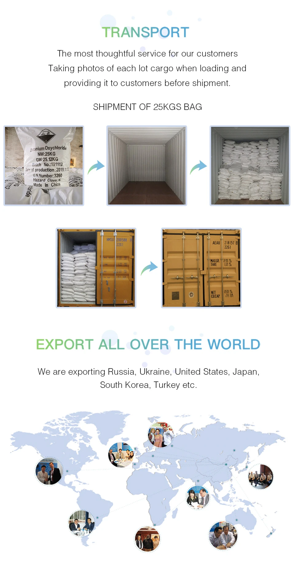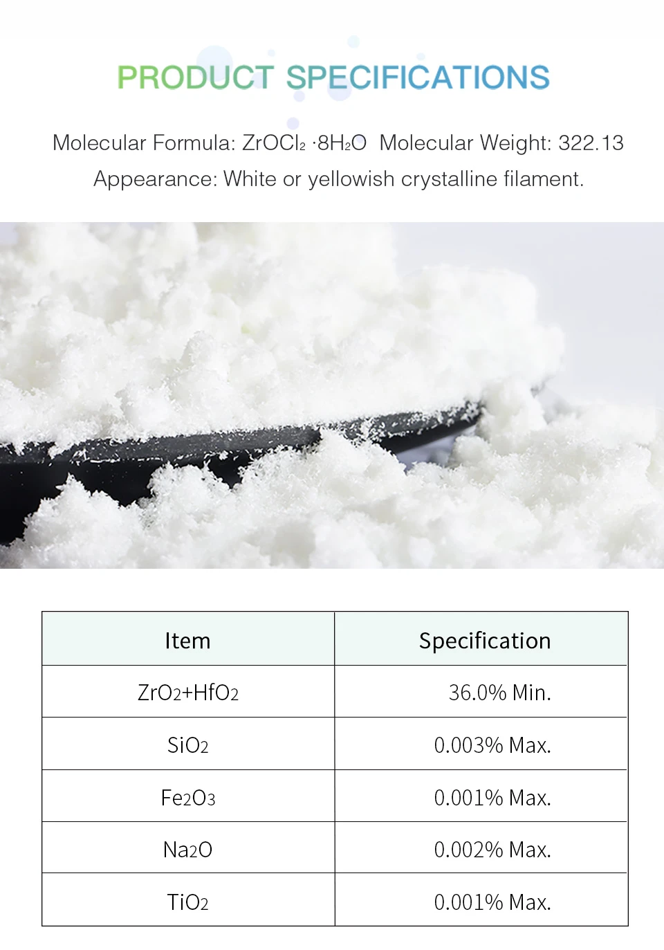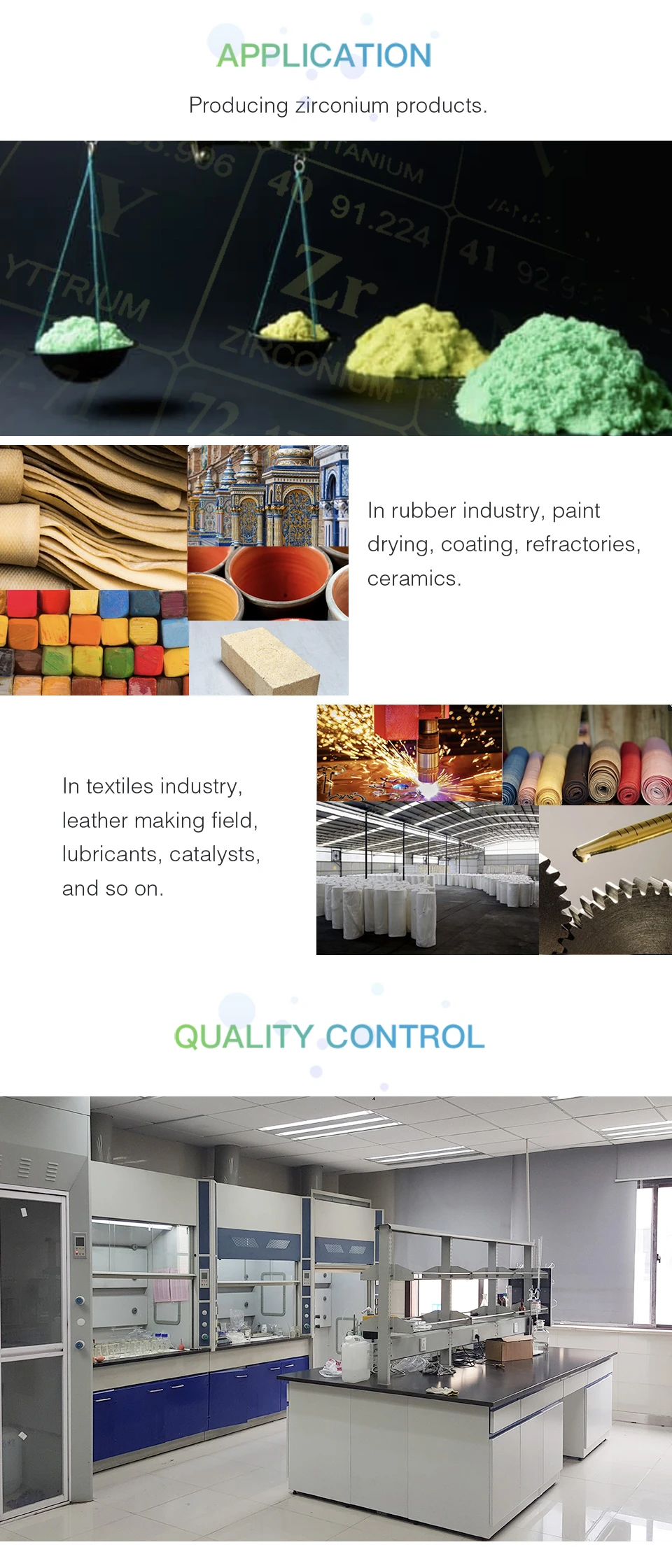 Usage:It is the main raw material of production of other zirconium products, widely used in textile, leather, rubber additives and metal surface treatment agent, paint dryer, refractories, ceramics, catalyst etc.