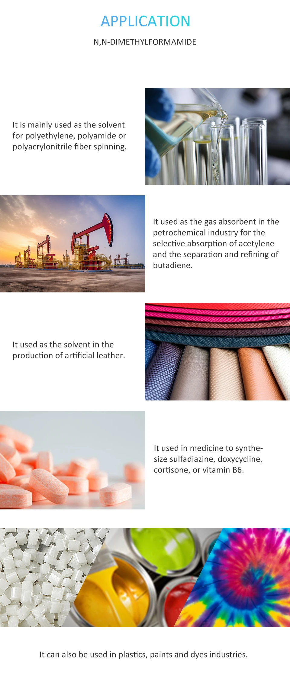 Usage:It is mainly used as the solvent for polyethylene, polyamide or polyacrylonitrile fiber spinning; used as the gas absorbent in the petrochemical industry for the selective absorption of acetylene and the separation and refining of butadiene; used as the solvent in the production of artificial leather; used in the synthesis of chlorphenamicine hydrochloride; used in medicine to synthesize sulfadiazine, doxycycline, cortisone, or vitamin B6; it can also be used in plastics, paints and dyes industries.