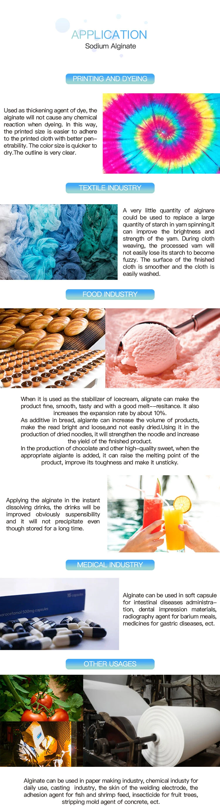 A. PRINTING AND DYEING INDUSTRY Used as thickening agent of dye, the alginate will not cause any chemical reaction when dyeing. In this way, the printed size is easier to adhere to the printed cloth with better penetrability. The color size is quicker to dry.The outline is very clear.