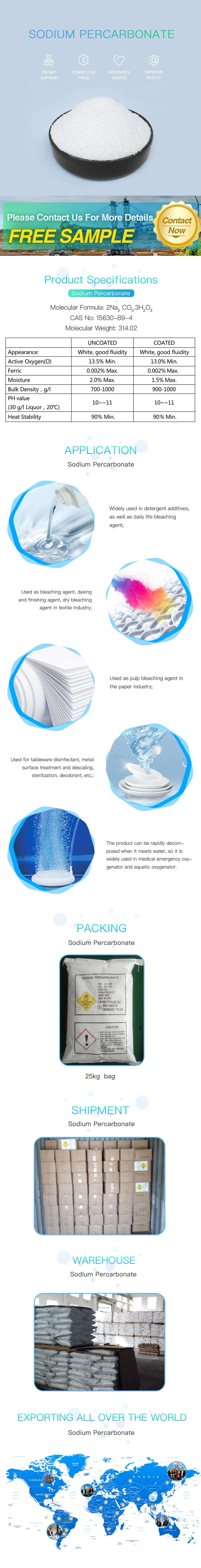 Usage:Sodium percarbonate is an environmentally friendly, high-performance low-temperature oxygen bleaching agent, and is widely used in industry as well as in daily life. It is increasingly replacing sodium perborate for uses in detergent, bleaching powder, wood floor cleaner, carpet cleaner and other household and personal care products. The product also has functions as a disinfector, oxygenation agent, and is utilized in industrial waste water treatment, sterilization, and first-aid. Oxygenation agent in aquaculture. Pulp bleaching agent for the paper industry. A bleaching agent and dyeing agent in the textile industry