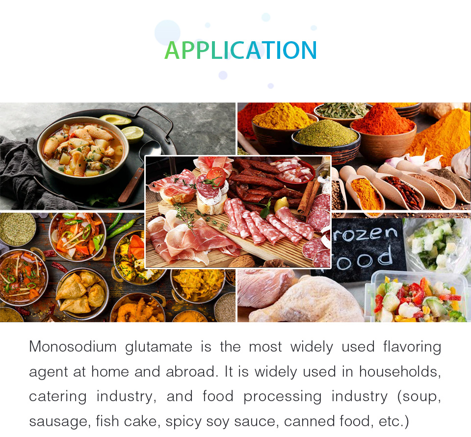 Usage:Monosodium glutamate is the most widely used flavoring agent at home and abroad. It is widely used in households, catering industry, and food processing industry (soup, sausage, fish cake, spicy soy sauce, canned food, etc.)