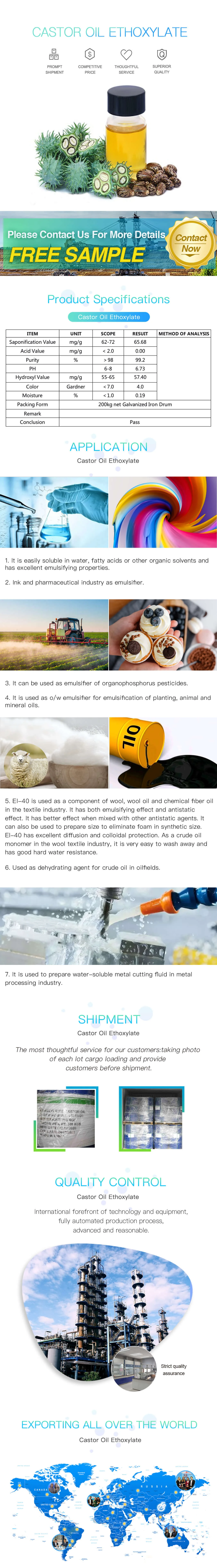 5. El-40 is used as a component of wool, wool oil and chemical fiber oil in the textile industry. It has both emulsifying effect and antistatic effect. It has better effect when mixed with other antistatic agents. It can also be used to prepare size to eliminate foam in synthetic size. El-40 has excellent diffusion and colloidal protection. As a crude oil monomer in the wool textile industry, it is very easy to wash away and has good hard water resistance.