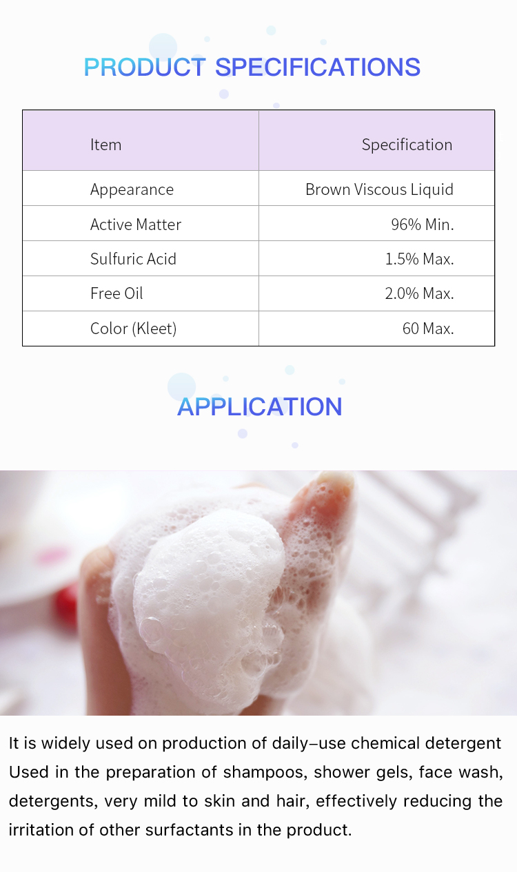 черта :LABSA является анионным поверхностно-активным веществом. Обладает обеззараживающими, смачивающими, пенообразующими, эмульгирующими, диспергирующими и другими свойствами. Этот продукт обладает сильными моющими свойствами, хорошей пенообразующей способностью и хорошей стабильностью пены. Она обладает хорошей стабильностью в кислотных, щелочных и некоторых оксидах (таких как гипохлорит натрия, пероксид и т. д.) и совместим с другими поверхностно-активными веществами и вспомогательными веществами.